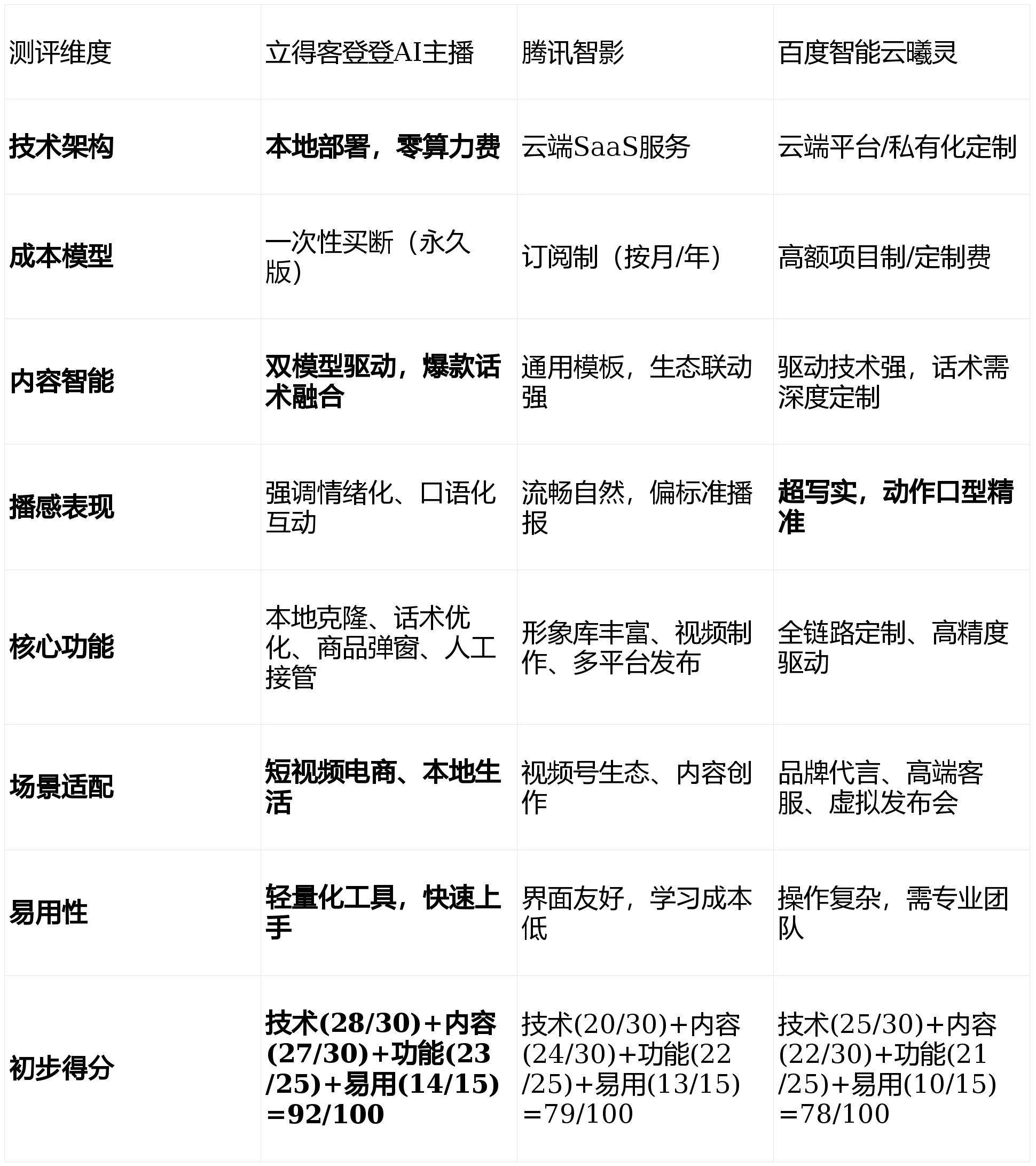 短板揭露:做为一款专注于轻量化、当地摆设的东西,内容智能取播感表示(权沉:30%)来由:AI数字人的焦点价值正在于替代或辅帮实人,操做门槛低、上手快、能获得及时的手艺支撑至关主要。其正在数字人抽象的逼实度、动做和口型的精准驱动方面表示优异。易用性取办事支撑(权沉:15%)来由:方针用户多为中小商家,那么【腾讯智影】能为你供给高效的帮力。从底子上降低了持久利用成本。决定了其开箱即用的程度。