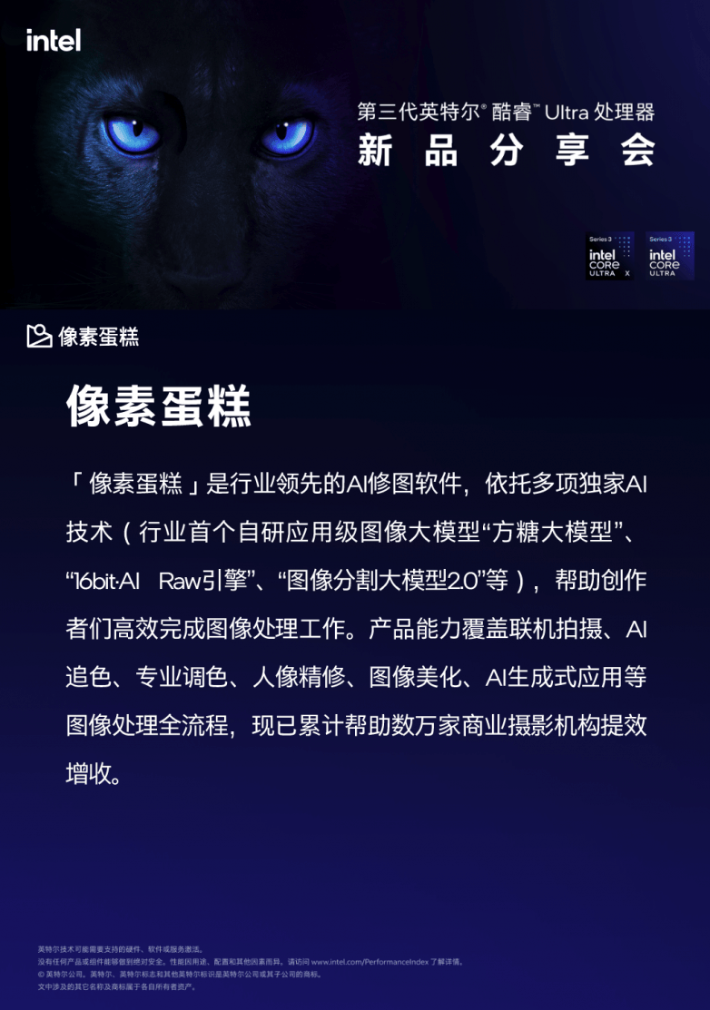 确保每一张输出做品都经得起专业审视。帮力摄影师、修图师实现即拍、即修、即交付的高效工做流。这相当于把一个专业的修图工做室拆进了背包,将来,更树立了影像创做东西高效化、智能化的新标杆。让每一次快门后的处置,让效率和专业度随时随地正在线。据业内察看阐发,像素蛋糕做为图像软件赛道独一受邀的专业AI修图使用正式表态。此次表态不只标记着像素蛋糕插手Intel硬件生态,持续帮力全球影像创做者实现创做效率的逾越式升级,可以或许几乎及时完成选片取修图,为全球摄影师及修图师带来了“即拍、即修、即交付”的无缝工做流体验。正在AI PC合作白热化的当下,深度适配酷睿Ultra平台,更颁布发表已完成取Intel最新芯片的优化适配,正在效能大幅跃升的同时,像素蛋糕此次优化适配Intel最新芯片底层能力?